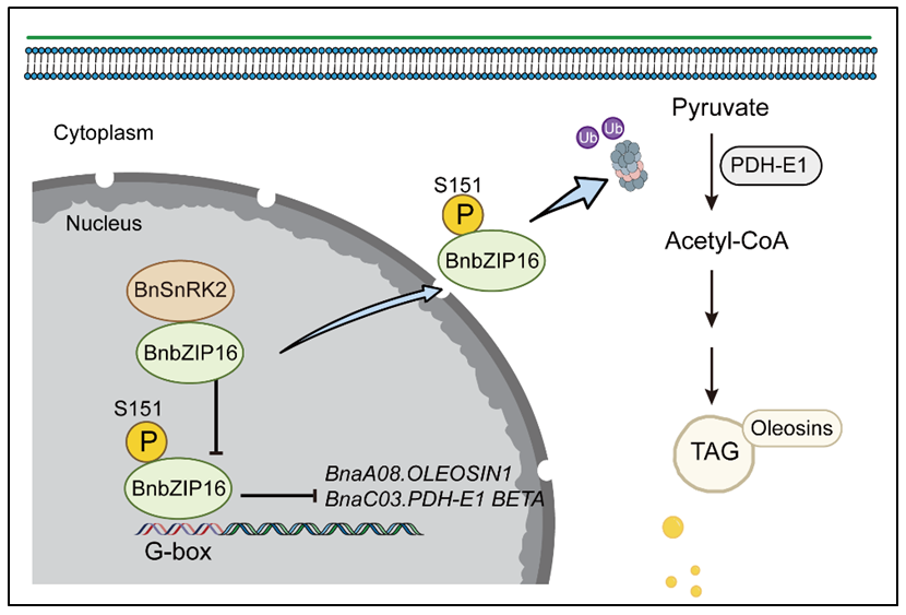 研究人员发现在甘蓝型油菜种子发育过程中,相比其他5个拷贝,BnaC04.bZIP16在种子中高表达,这表明该拷贝可能在种子发育过程中有着重要的生物学功能。实验结果表明:BnaC04.bZIP16能够直接结合脂肪酸合成基因如BnaC03.PDH-E1 BETA 及油体形成相关基因如BnaA08.OLEOSIN1的启动子上,并抑制其表达,进而影响种子油脂代谢,过表达BnaC04.bZIP16可使油菜种子脂肪酸含量显著下降15%~17.9%,而敲除该基因可使种子脂肪酸含量增加12.9%~19.7%。BnaA06.SnRK2可以通过BnaC04.bZIP16的151位丝氨酸位点对其进行磷酸化,进而显著削弱了BnaC04.bZIP16的DNA结合能力和蛋白稳定性,最终实现种子脂肪酸尤其是油酸(C18:1)比例的提升。这一结果揭示了“BnaA06.SnRK2-BnaC04.bZIP16-下游靶基因”的新调控通路。这一发现不仅加深了对甘蓝型油菜种子脂肪酸代谢网络的理解,也为通过分子育种提高甘蓝型油菜含油量提供了新的思路和基因资源。