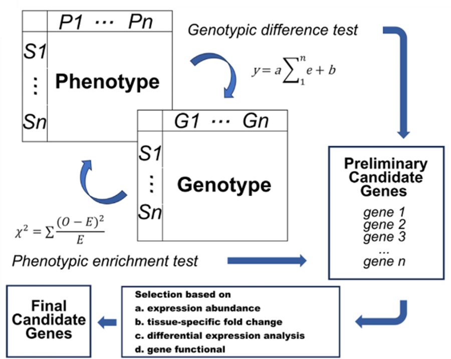 本研究以河北师范大学李俊明教授(原中国科学院遗传与发育生物学研究所研究员)培育的“科农9204”为材料,在前期构建的EMS近饱和突变体库基础上(Wang et al., 2023, Plant Communications),利用深度学习驱动的图像表型鉴定平台(Sun et al., 2025, Plant Phenomics),对近2000个突变株系进行了高通量图像采集和表型分析,共提取了83个株型和穗部性状。为解决EMS突变体中低频突变的分析难题,团队基于该突变体库的外显子捕获测序数据,优化了分析策略并开发了GH-GLA流程。该流程将分析单元从“单个突变位点”提升至“整个基因”,从而显著提高了突变体库的利用效率。