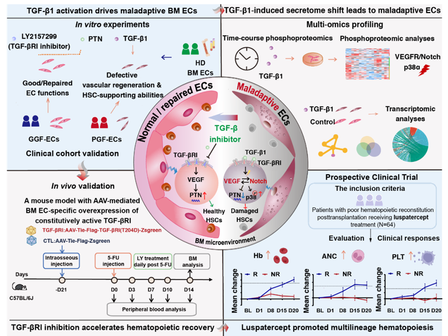 北京大学血液病研究所、国家血液系统疾病临床医学研究中心黄晓军院士、孔圆教授团队联合中国科学院遗传与发育生物学研究所汪迎春研究员团队研究发现:过度激活的TGF-β1信号可驱使骨髓血管内皮细胞发生适应不良性修复,表现为关键造血因子分泌显著减少,而纤维化和上皮-间质转化(EMT)相关通路被过度激活。这种细胞状态的转变伴随着VEGF/Notch信号交互的失调与p38 MAPK通路的持续活化,破坏骨髓血管微环境的支持功能,最终导致造血重建失败。机制的阐明有利于推动治疗策略的创新,本团队不仅在临床前模型中证实使用TGF-βRI抑制剂可逆转上述过程,而且进一步开展前瞻性临床研究,采用TGF-β配体陷阱药物Luspatercept成功改善了移植后造血重建不良患者的多谱系造血修复,为这类难治性移植并发症提供了全新的治疗思路。该项研究从分子—细胞—组织—临床多维度系统解析了TGF-β1通路在骨髓微环境适应不良修复中的核心作用,不仅深化了对造血重建不良发病机制的理解,也开创了以“骨髓微环境修复”为靶点的治疗新范式,为改善疾病状态下造血再生修复带来重要曙光。