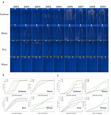 根系在应对生物和非生物胁迫方面发挥着关键作用,其形态建成和早期发育的无损动态监测,对于基础研究和育种应用均具有重要意义。中国科学院遗传与发育生物学研究所联合西北农林科技大学、崖州湾实验室、浙江大学、慧诺瑞德宏表型实验室等单位于2025年12月1日在The Crop journal期刊在线发表了题为为HTPRootSlides: A high-throughput phenotyping platform for crop root germination dynamic screening的研究论文。该研究开发了一种名为HTPRootSlides的高通量根系表型平台,用于作物根系萌发动态的测量。该平台能够高通量、长时间序列的采集根系早期萌发图像,并通过集成图像处理软件自动提取数十种根系表型参数,生成数据报表,显著降低了育种工作者获取根系表型信息的难度。