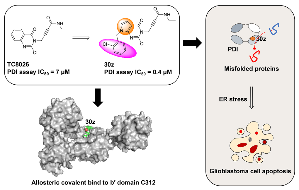 蛋白二硫键异构酶(Protein Disulfide Isomerase, PDI)是内质网中维持蛋白质折叠稳态的关键氧化还原酶和分子伴侣。近年来研究表明,PDI在多种肿瘤中高表达,尤其在胶质母细胞瘤(Glioblastoma, GBM)中与肿瘤细胞的生存、侵袭和耐药密切相关,因此被认为是有潜力的抗肿瘤治疗靶点。已报道的PDI抑制剂大多通过直接修饰其催化半胱氨酸发挥作用,这种策略选择性相对不足、脱靶风险高、临床转化难度大。如何在保证抑制活性的同时提高对PDI的家族选择性,是该领域面临的难题。