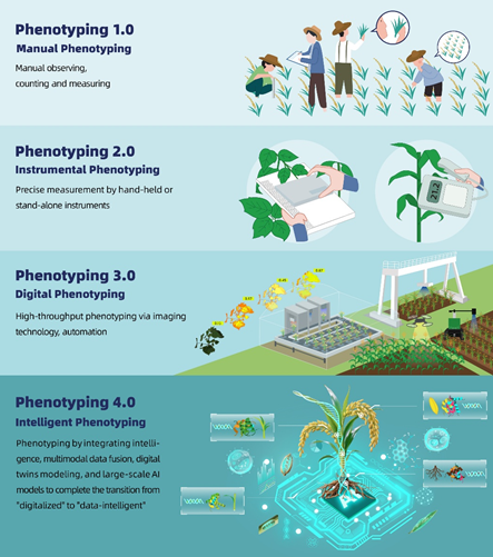 文章首次以清晰的时代划分,系统构建了植物表型技术从人工观察到智能融合的完整发展路线,将其定义为Phenotyping 1.0至4.0四个核心演进阶段。其中,1.0人工表型时代完全依赖人工主观经验完成作物基础评判,存在极强主观性、极低通量的核心局限;2.0仪器表型时代依托各类仪器实现了作物表型的客观、可重复量化测量,为早期数量性状位点定位研究奠定了数据基础;3.0数字表型时代,以成像技术为核心融合多类工程技术,实现了表型数据的高通量、多尺度数字化采集,但因海量数据爆发带来了“数据海啸”与“知识孤岛”难题;4.0智能表型时代以人工智能大模型、智能体集群与数字孪生技术为核心驱动力,通过跨维度整合分析实现基因、表型与环境的端到端关联,推动作物育种从“数字化”正式迈入“数据智能”时代。