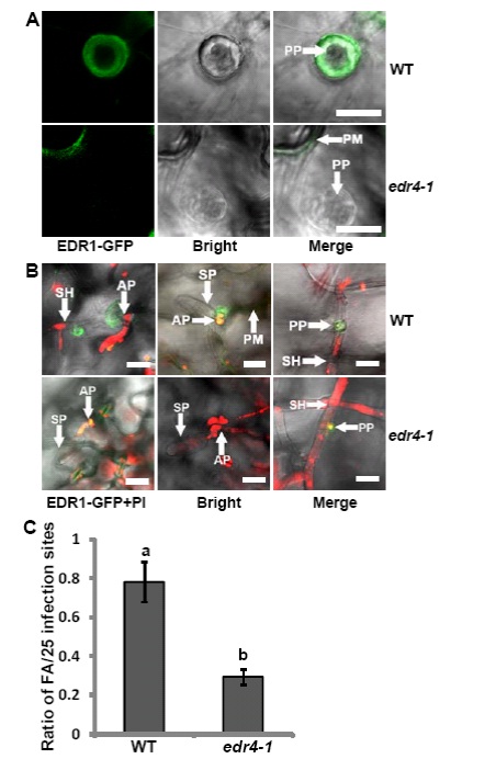 白粉菌侵染后EDR1蛋白在在叶表皮细胞白粉菌侵染处聚集,而EDR1的聚集依赖于EDR4