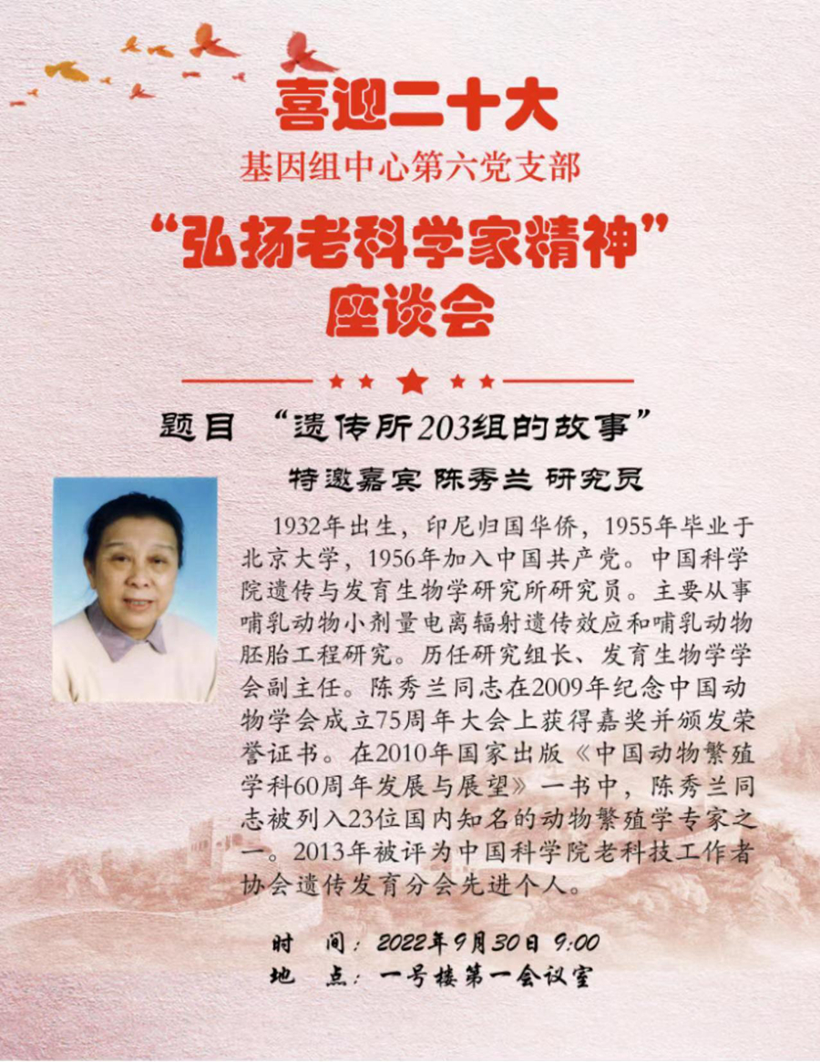 习近平总书记指出“科学成就离不开精神支撑。科学家精神是科技工作者在长期科学实践中积累的宝贵精神财富”。为进一步弘扬科学家精神,加强作风和学风建设,在祖国华诞及二十大即将召开之际,2022年9月30日上午,中国科学院遗传与发育生物学研究所基因组生物学研究中心第六党支部召开党员大会暨“弘扬老科学家精神”座谈会。会议邀请研究所90岁高龄的老科学家陈秀兰研究员讲述“遗传所203组的故事”。党委副书记、纪委书记申倚敏出席会议,会议由支部书记任勃主持。