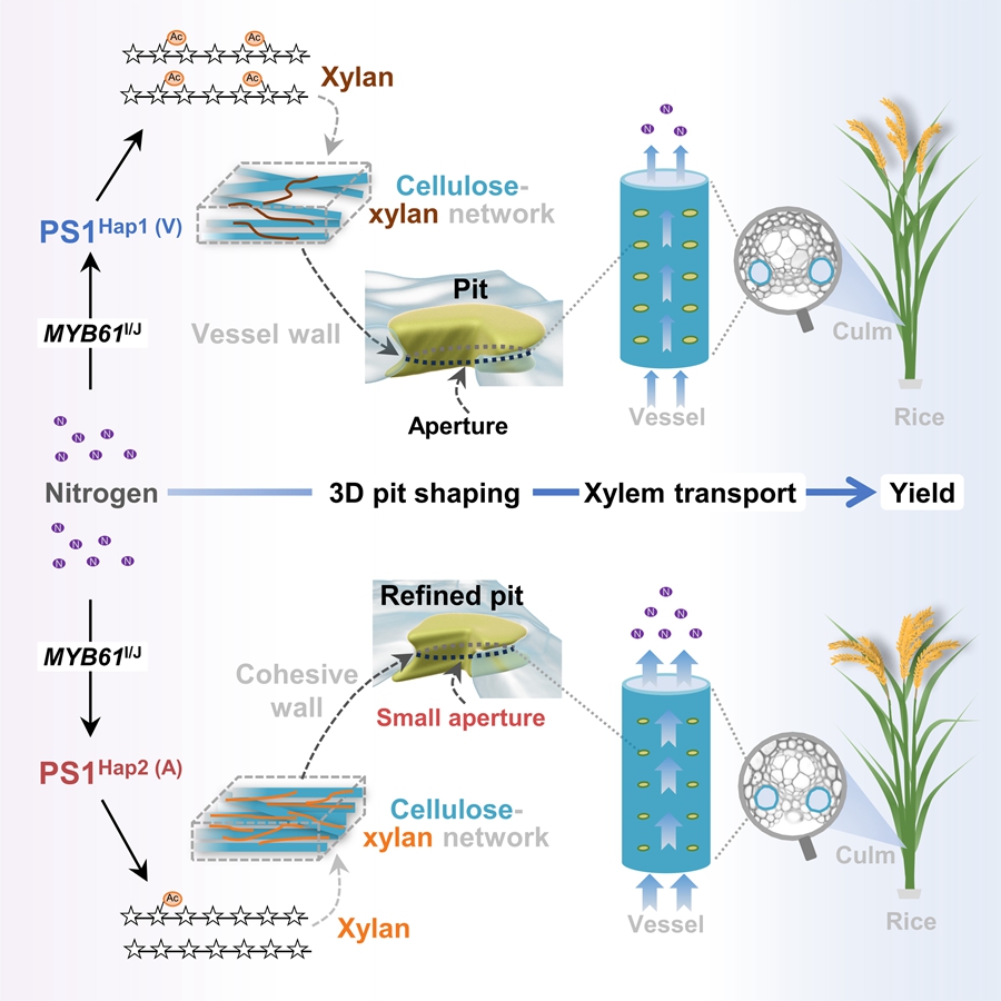 木质部导管纹孔的三维精细结构受到QTL分子模块MYB61-PS1的精准控制:PS1介导纹孔周边木聚糖去乙酰化与三维腔室结构形成,并通过氮高效QTL基因MYB61的转录调控响应氮素改变,在维持木质部稳健性、促进氮素运输与作物高产中发挥关键作用。