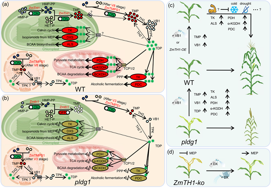2025年10月13日,中国科学院遗传与发育生物学研究所陈化榜团队在Plant Biotechnology Journal杂志在线发表了题为ZmTH1 Is Vital for Healthy Plant Growth and Promotes Cold/Drought Tolerance by Regulating Thiamin Diphosphate-Dependent Metabolisms in Maize 的研究论文。该研究从一个苗期叶片失绿、后期生长发育不良的玉米自然突变体pldg1入手,通过BSA、图位克隆和遗传验证,确认ZmTH1是控制该表型的关键基因。ZmTH1编码一个定位于叶绿体的双功能酶,包含HMPP-K和TMP-S两个保守结构域,负责催化VB1合成中的两个连续反应。ZmTH1的旁系同源基因ZmTMPS1仅编码TMP-S结构域,且存在于细胞质与细胞核,仅具备部分催化活性。功能互补实验表明,ZmTH1编码的两个结构域可独立行使功能,而pldg1突变体蛋白因丧失TMP-S活性,其存活依赖于ZmTMPS1的部分功能补偿,这解释了为何ZmTH1完全敲除株系致死的遗传现象。这一发现揭示了VB1合成在玉米细胞内存在叶绿体与细胞质/细胞核协同作用的新模式。进一步分析发现,pldg1突变体中单磷酸硫胺素(TMP)、VB1、TDP含量均显著下降,导致多种TDP依赖酶活性受损。随后的转录组与初级代谢组联合分析表明,突变体中TDP依赖的多个代谢通路如卡尔文循环、三羧酸循环、磷酸戊糖途径、支链氨基酸代谢等核心代谢网络被全面扰乱,从而导致pldg1突变体表型;而苗期叶片黄白化则是由于萜类物质合成的MEP途径受损所致。研究还发现,在正常玉米中过表达ZmTH1或外源喷施一定浓度的VB1,能显著提升TDP依赖酶活性,并赋予转基因植株和野生型植株苗期的耐寒性与耐旱性。在干旱和寒冷胁迫下,过表达株系和VB1处理组的苗期存活率远超对照组,且氧化损伤程度显著降低。这为通过基因工程或叶面肥施用策略提升作物耐逆性提供了实践证据。