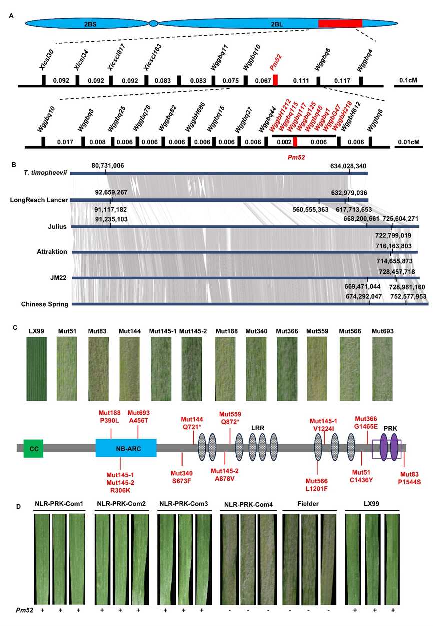 2025年10月21日,中国科学院遗传与发育生物学研究所植物免疫团队联合湘湖实验室(农业浙江省实验室)小麦抗病生物学团队及中国农业科学院作物科学研究所小麦基因资源发掘与利用团队在Plant Communications在线发表题为Wheat powdery mildew resistance gene Pm52/Pm6 from Triticum timopheevii encodes an NLR integrated with PRK domain的研究论文。这项研究综合利用图位克隆、PacBio HiFi和Hi-C测序技术,成功从小麦主栽品种良星99和济麦22中克隆了抗白粉病基因Pm52,发现该基因源自提莫菲维小麦(Triticum timopheevii),编码一个新型NLR-PRK融合蛋白,具有广谱抗性,并且证实Pm52与Pm6为同一基因。同时,开发了Pm52功能分子标记Pm52-FM,为小麦育种的分子标记辅助选择提供可靠工具,有助于该抗性基因快速高效应用。