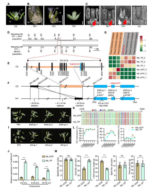 近日,中国科学院遗传与发育生物学研究所/崖州湾国家实验室凌宏清研究员团队及合作者在Plant Communications期刊上发表了题为Structure variation-driven activation of TaWUS-D1 confers tri-pistil trait in wheat的研究论文,揭示了三雌蕊小麦(tri-pistil wheat)形成的遗传基础。团队通过遗传学、基因组学和分子生物学等方法分离了三雌蕊小麦的关键控制基因TaWUS-D1;研究发现TaWUS-D1上游的结构变异可能通过降低其启动子区域的DNA甲基化水平进而激活TaWUS-D1在小花发育期的特异表达,而非基因本身的序列变异所致。这项研究不仅解开了长期存在的遗传谜题,也为未来培育高产小麦提供了理论基础和宝贵的基因资源。