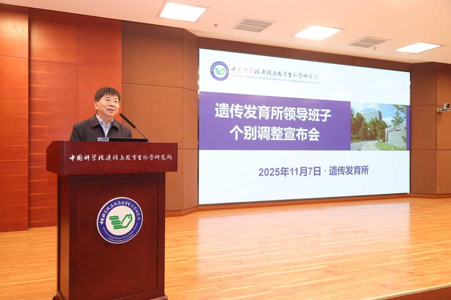 2025年11月7日上午,中国科学院遗传与发育生物学研究所召开领导班子个别调整宣布会。中国科学院人事局副局长蔡宏志、领导干部二处处长宋琦、遗传发育所班子成员、两委委员、副高级及以上科研骨干和管理支撑人员等职工代表参加了会议。会议由研究所党委书记兼副所长邢雪荣主持。