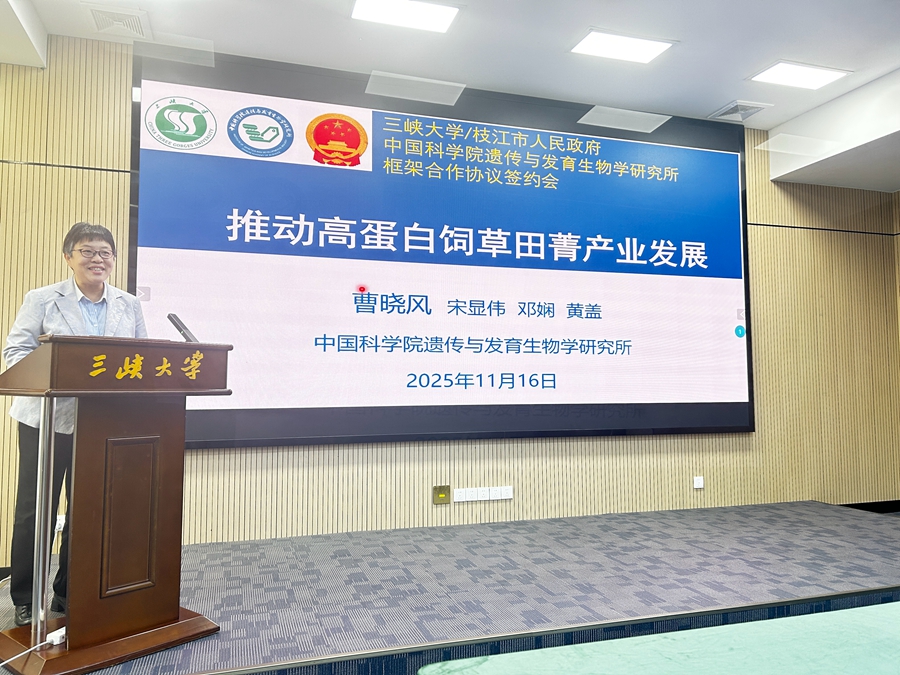 2025年11月16日,中国科学院遗传与发育生物学研究所与三峡大学、枝江市人民政府签署框架合作协议,启动高蛋白饲草田菁全产业链项目。遗传发育所副所长鲁非研究员、曹晓风院士,三峡大学副校长张成,枝江市副市长黄爱民等见证签约。此次合作构建“政产学研用”创新共同体,为破解饲料粮短缺、盐碱地综合利用及乡村振兴注入科技动能。