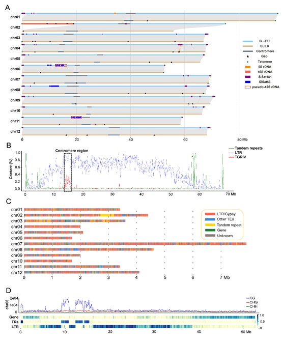 中国科学院遗传与发育生物学研究所梁承志研究团队利用Oxford Nanopore Technologies(ONT)的最新高精度单分子超长测序技术,成功构建了高质量的番茄端粒到端粒参考基因组(SL-T2T),填补了此前版本的多个缺失序列,并详细注释分析了核糖体基因和着丝粒结构、卫星重复序列和全基因组甲基化图谱。该研究为番茄功能基因组学研究与分子育种提供了重要的基础数据资源。