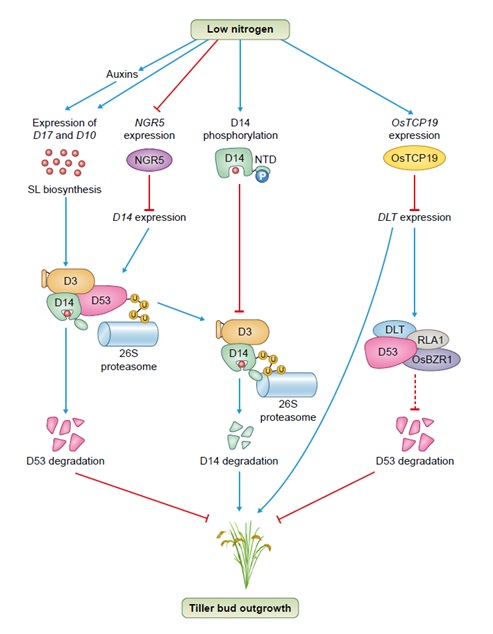 图1 独脚金内酯通路在低氮抑制分蘖中的核心作用