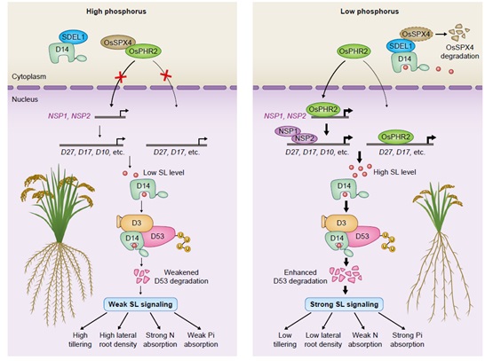 独脚金内酯合成基因低表达,水稻分蘖多。在低磷环境下,独脚金内酯促进D14在细胞质中与泛素连接酶SDEL1互作,促进