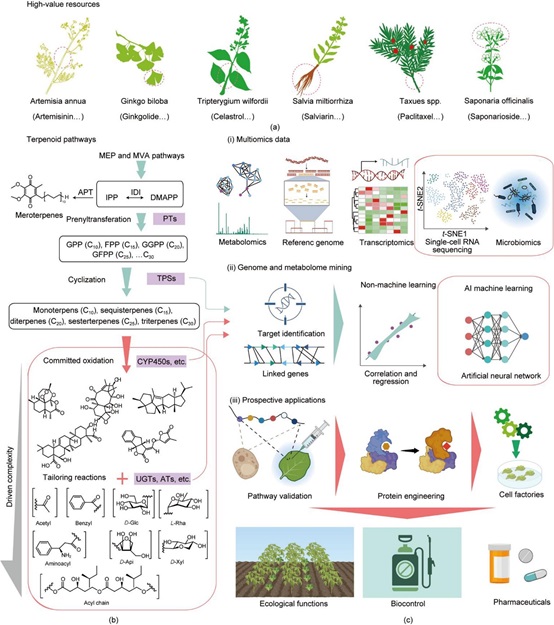 中国科学院遗传与发育生物学研究所王国栋研究员应邀为“千种本草基因组计划”撰写专题综述,文章首先系统总结了近年来上游碳–氢骨架生物合成途径中的关键酶功能、通路调控机制以及物种特异性差异等最新研究进展;随后,重点讨论了用于解析下游修饰反应分子机制的关键技术与研究方法,包括多组学联合分析、基因沉默与过表达技术、体外酶活验证体系等,并特别聚焦于这些技术在药用植物萜类合成机制研究中的应用案例;最后,深入探讨并展望了植物萜类化合物生物学功能研究的最新动态与未来方向,尤其关注其在植物体内的生理作用,如抵御生物与非生物胁迫、调控植物生长发育、介导植物与其他生物间的相互作用等。该综述旨在全面、系统地概述植物萜类生物合成及其功能鉴定领域的当前研究趋势与核心认识,为“千种本草基因组计划”的深入推进提供理论参考,同时为药用植物萜类资源的开发利用与创新研究奠定基础。