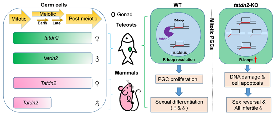 Tatdn2是从研究组前期工作(Genome Biology, 2020)产生的组学数据中挖掘得到,实验和跨物种分析证实其在具有有丝分裂活性的生殖细胞中保守表达。以青鳉(Oryzias latipes)为模型发现tatdn2缺失引起有丝分裂期PGCs耗竭,导致所有成体均为雄性并丧失生育能力。进一步研究发现tatdn2敲除显著增加R-loop积累与DNA损伤,继而触发PGCs凋亡。