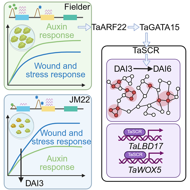 https://www.sciencedirect.com/science/article/pii/S2211124725015153),报道了通过整合Fielder和济麦22再生过程的转录组和染色质可及性图谱,揭示了染色质重塑和转录调控网络在塑造小麦基因型依赖的再生中的关键作用,并建立了TaSCR-TaLBD17调控模块以高效克服小麦主栽品种转化难的问题。