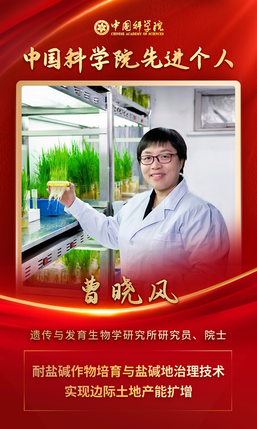 曹晓风胸怀“国之大者”,长期致力于植物表观遗传学研究并取得国际公认的成就。面向国家粮食安全重大需求及盐碱地综合利用战略布局,她毅然将科研主攻方向转向盐碱地生物改良这一世界性难题。作为中国科学院重点部署项目边际土地产能效益扩增机理与藏粮于地技术模式项目负责人、中国科学院“黑土粮仓”科技会战先导专项课题负责人、中国科学院抢占科技制高点重大科技任务科学顾问,她带领团队长期深入艰苦的盐碱地一线,成功发掘并培育出耐盐碱先锋植物田菁系列新品系,创建的“田菁高效建植生物改良盐碱地技术”入选2025年中国农业重大新技术,在东北、新疆等地示范推广面积已达5万余亩,为推动我国北方盐碱荒(草)地改良与修复、保障国家粮食安全作出了突出贡献,真正将论文写在祖国大地上。