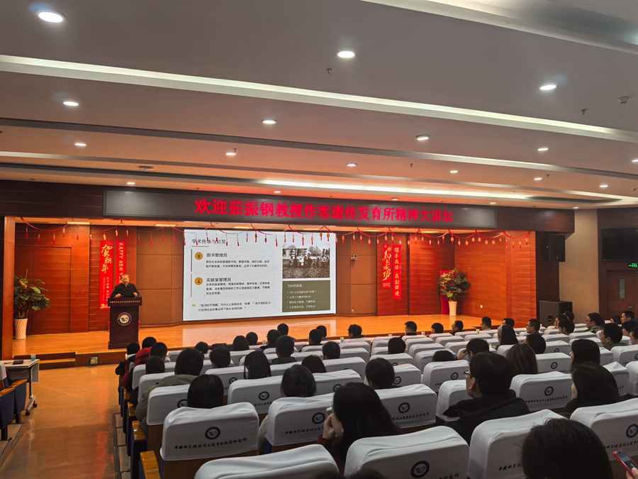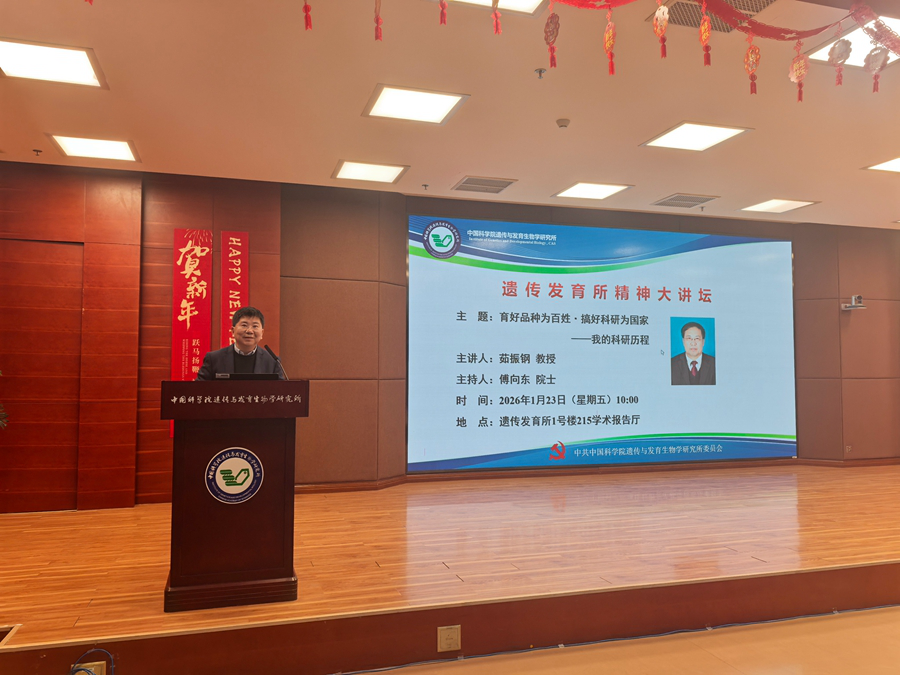 2026年1月23日上午,中国科学院遗传与发育生物学研究所精神大讲坛专题报告会在研究所1号楼215学术报告厅举行。河南省小麦生物学与规模化高效生产重点实验室主任茹振钢教授应邀作题为《育好品种为百姓·搞好科研为国家-我的科研历程》的专题报告。党委委员曹晓风院士、副所长鲁非研究员、育种前沿技术实验室第四党支部书记贺飞研究员以及研究所师生与职工代表参会。报告会由副所长(主持工作)傅向东院士主持。