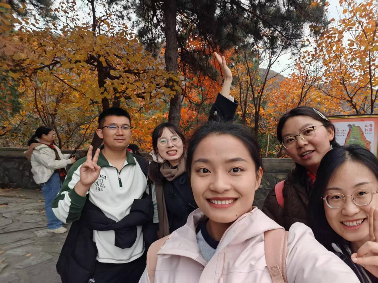 随后,队伍沿“勤政殿—静翠湖—双清别墅—香炉峰”经典路线徒步攀登。秋日的香山层林尽染,静翠湖碧波荡漾,绚秋林色彩斑斓。同学们在登山过程中互相鼓励、协同前行,不仅在香炉峰顶俯瞰了北京城的壮丽全景,也在亲近自然的过程中有效缓解了科研压力,增进了彼此之间的交流与情谊。