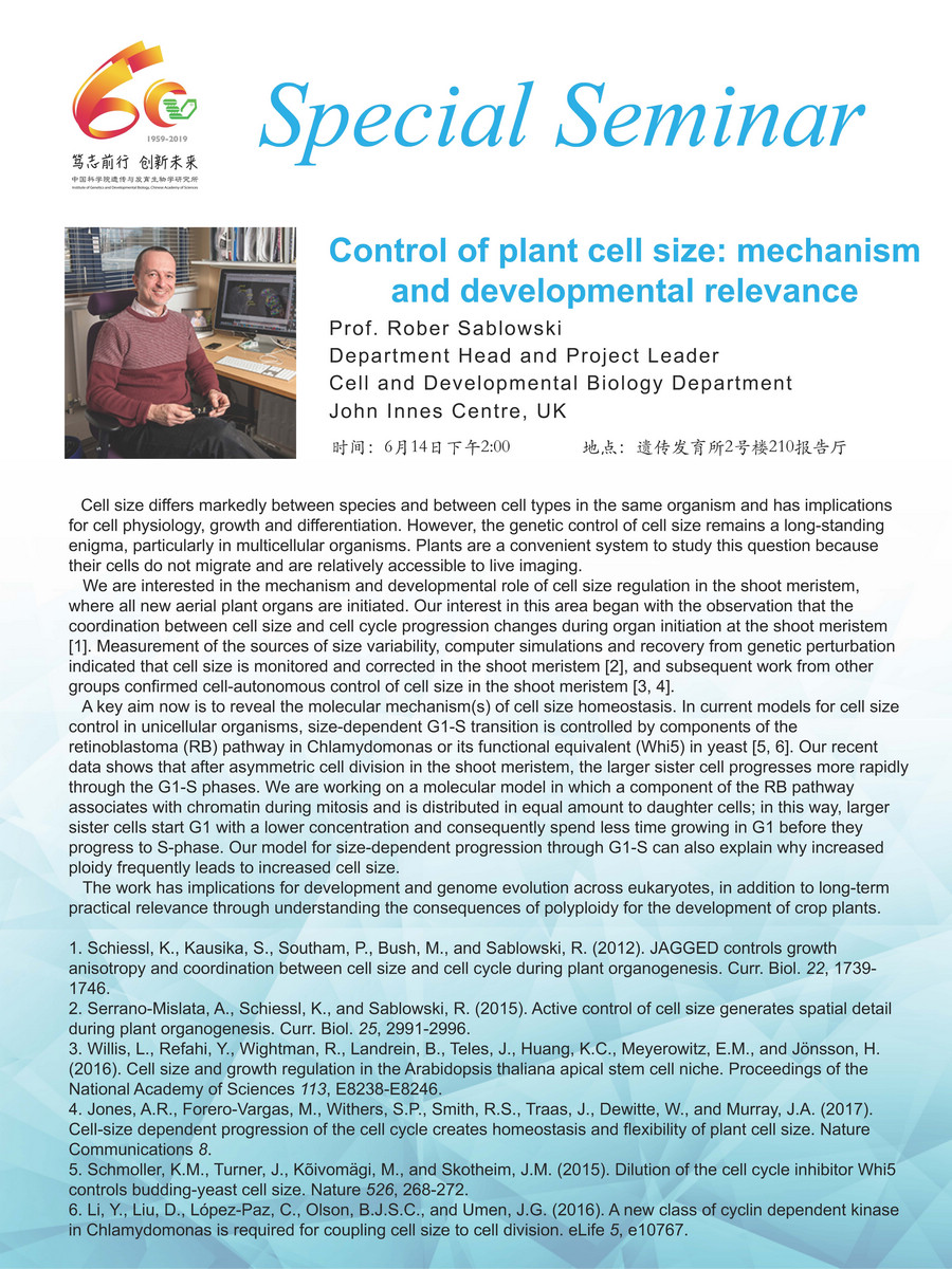 Control of plant cell size: mechanism and developmental relevance(报告时间:2019年6月14日14:00)