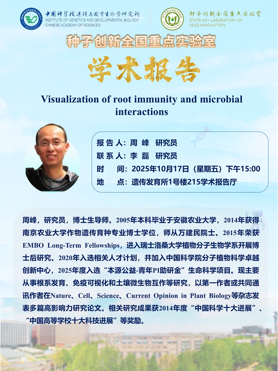 种子创新全国重点实验室学术报告:Visualization of root immunity and microbial interactions (2025年10月17日,15:00)