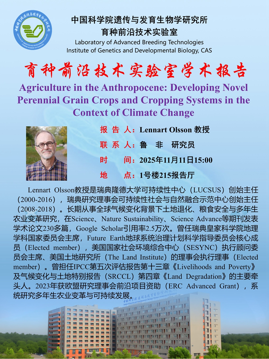 育种前沿技术实验室学术报告:Agriculture in the Anthropocene: Developing Novel Perennial Grain Crops and Cropping Systems in the Context of Climate Change(11月11日15:00)